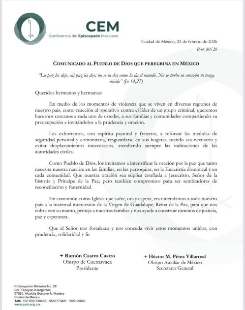 Ante la jornada de violencia y los bloqueos registrados en diversas regiones del País como reacción a un operativo contra el líder de un grupo criminal, la Conferencia del Episcopado Mexicano emitió un llamado urgente a la ciudadanía para resguardarse en sus hogares y evitar desplazamientos innecesarios.