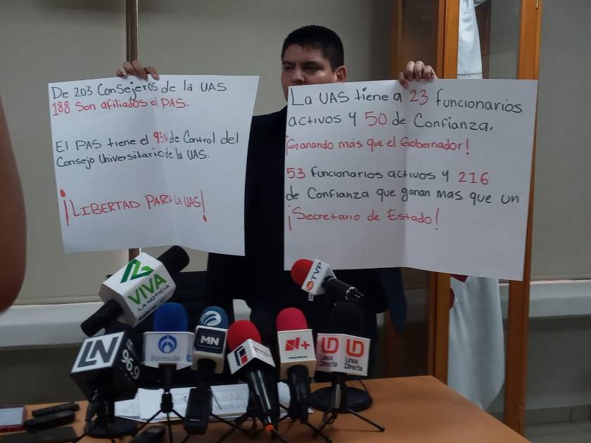 También expuso que de los 203 consejeros universitarios que tiene la UAS, 188 están afiliados al Partido Sinaloense, es decir, representan el 93 por ciento del órgano que vota decisiones en la Universidad.