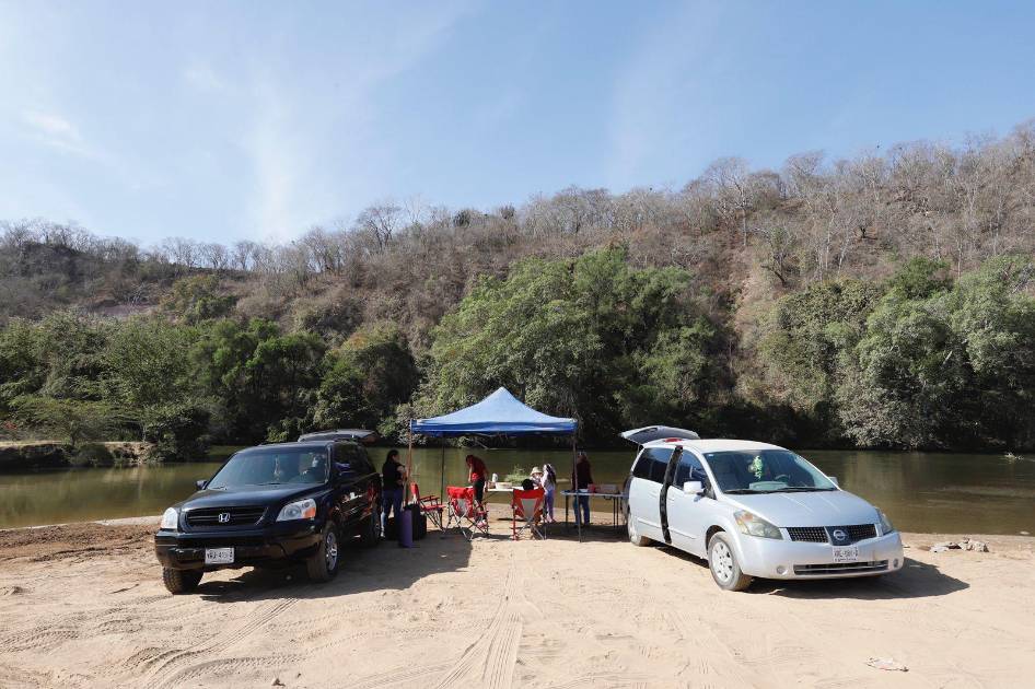 La mañana de este Jueves Santo, visitantes provenientes de Culiacán ya se instalan en el cauce del Río Tamazula, en las inmediaciones del poblado Jotagua.