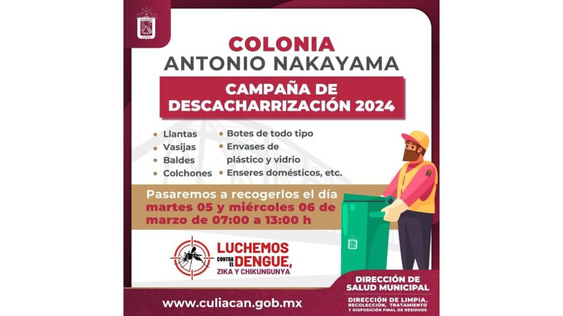 Se recogerán desechos o cacharros en la colonia Antonio Nakayama, esto como parte de la Campaña de Descacharrización 2024, informó la Dirección Municipal del Ayuntamiento de Culiacán.
