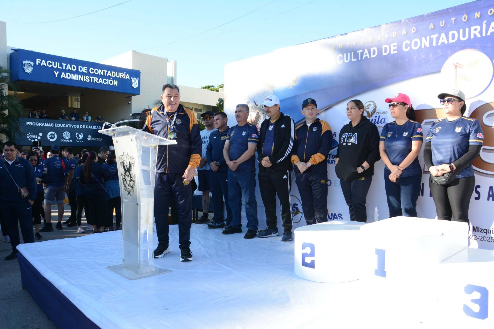 “Con esta carrera de Aniversario y de cierre de actividades de los 78 años de la FCA queremos demostrarle a la sociedad sinaloense y decirle que la Universidad sigue cumpliendo, es una responsabilidad nuestra seguir formando a egresados de calidad y el deporte forma en todos los ámbitos, y que la Universidad no se detiene, las instrucciones de nuestro Rector y del Encargado del Despacho de Rectoría nos lo han dicho: no descuiden las actividades sustantivas (...) hoy con el deporte estamos dando una muestra más de lo que es la Universidad Autónoma de Sinaloa y la grandeza de la FCA”, manifestó.