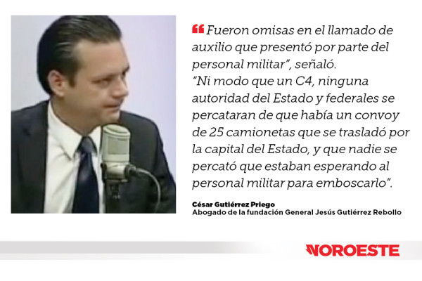 "Al no haber existido ese auxilio, o en su defecto también el trabajo de seguridad pública que tendrían que realizar, por omisión se vio, ni modo que un C4, ninguna autoridades del Estado y federales se percataran de que había un convoy de 25 camionetas que se trasladó por la capital del Estado, y que nadie se percató que estaban esperando al personal militar para emboscarlo", planteó.