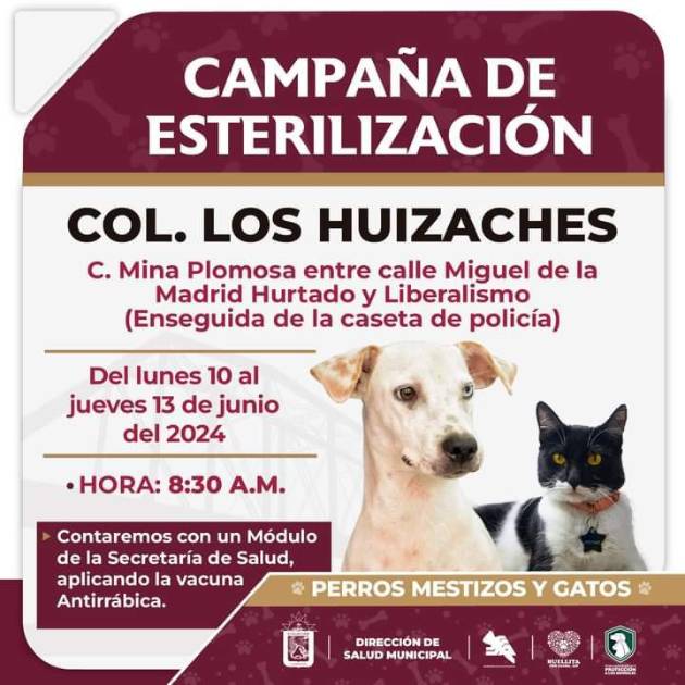 CULIACÁN._ A partir de este lunes 10 al jueves 13 de junio, habrá campaña de esterilización de perros y gatos mestizos en la colonia Los Huizaches, Culiacán, organizada por la Unidad de Protección de Animales y la Dirección de Salud Municipal.