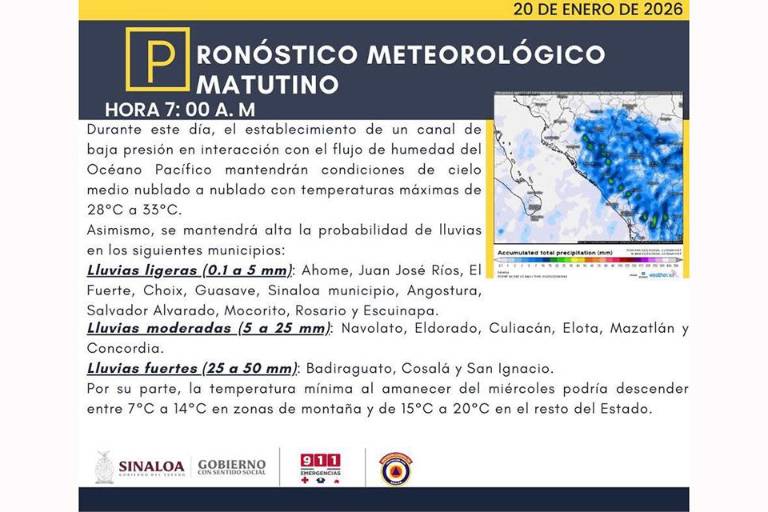 Este martes 20 de enero, Sinaloa enfrenta un panorama meteorológico complejo debido a la interacción de diversos fenómenos que traerán desde precipitaciones fuertes hasta un marcado descenso en las temperaturas de las zonas altas.