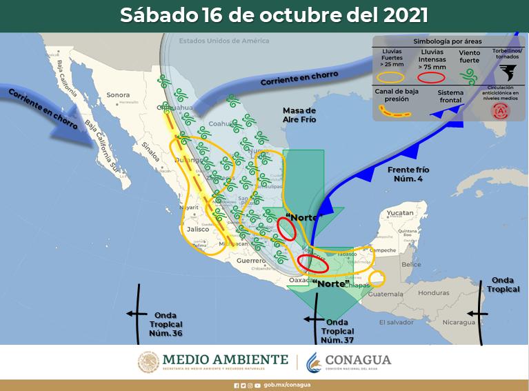 “Pacífico Norte: Cielo medio nublado por la mañana y nublado durante la tarde con chubascos acompañados de descargas eléctricas en Sinaloa y lluvias aisladas en Sonora. Ambiente fresco por la mañana”.