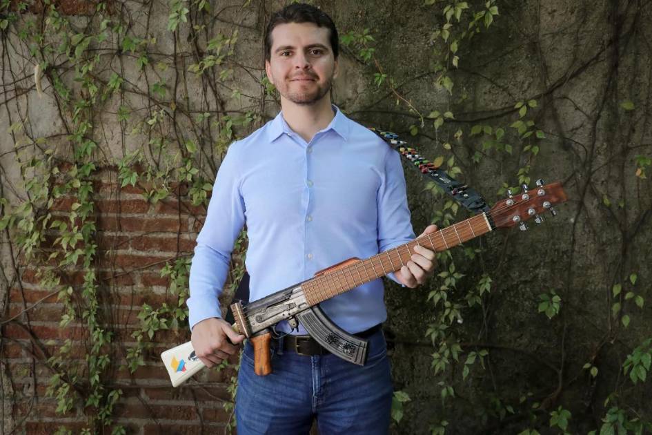 La Escopetarra es una guitarra completamente funcional, fabricada con la estructura de un fusil AK-47 real que fue desactivado.