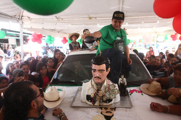 A Malverde se le hace procesión, pero ésta es bañándolo con alcohol y bailando a música de banda.