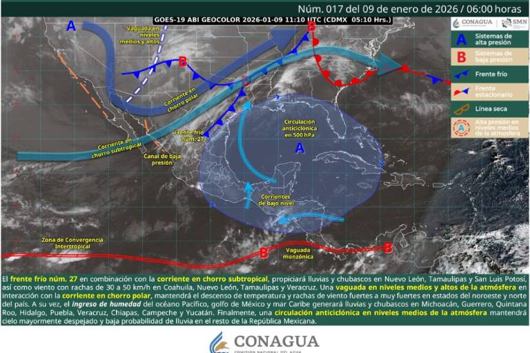 Este panorama está influenciado por el frente frío número 27 en combinación con la corriente en chorro subtropical.