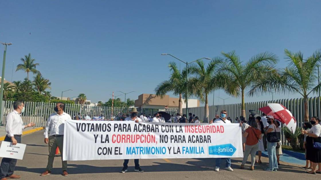 Este martes, Sinaloa puede convertirse en el estado 20 en la República Mexicana en permitir que las personas del mismo sexo puedan contraer matrimonio, por lo que viendo esta posibilidad, grupos en contra tomaron la entrada al recinto legislativo, al cual no pueden entrar.