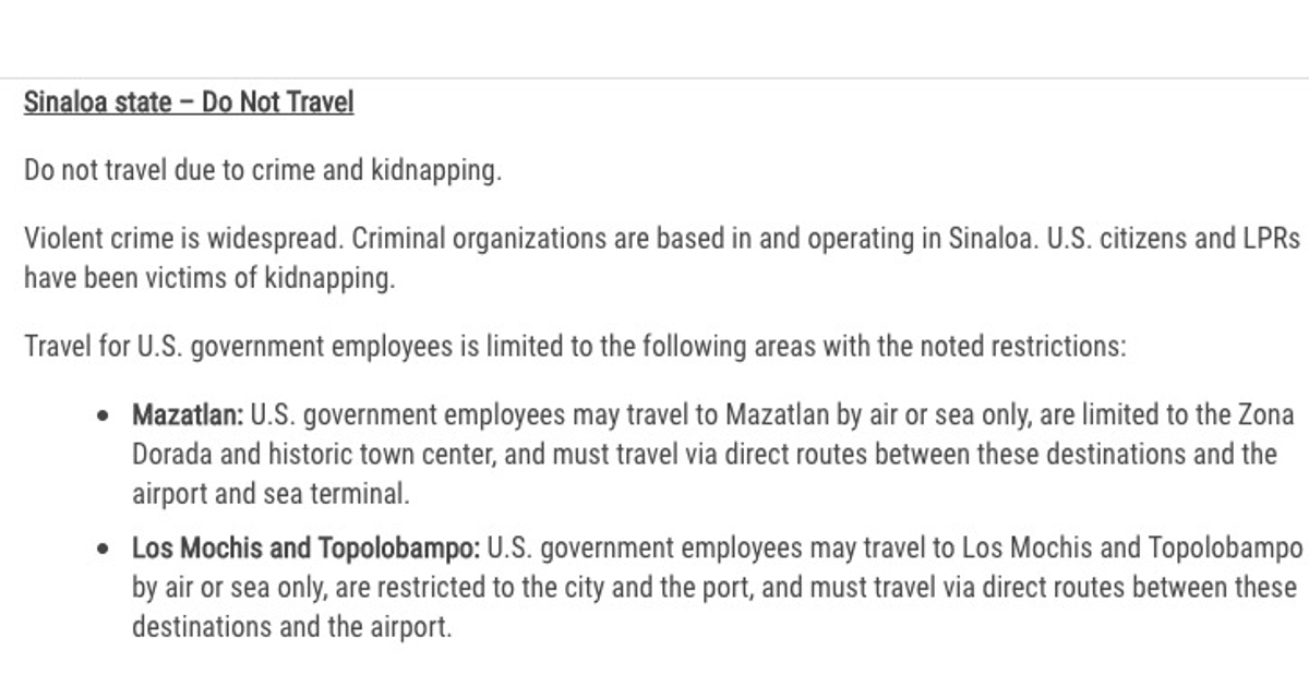 “Los empleados del gobierno estadounidense pueden viajar a Los Mochis y Topolobampo únicamente por vía aérea o marítima, están restringidos a la ciudad y el puerto, y deben viajar por rutas directas entre estos destinos y el aeropuerto”.