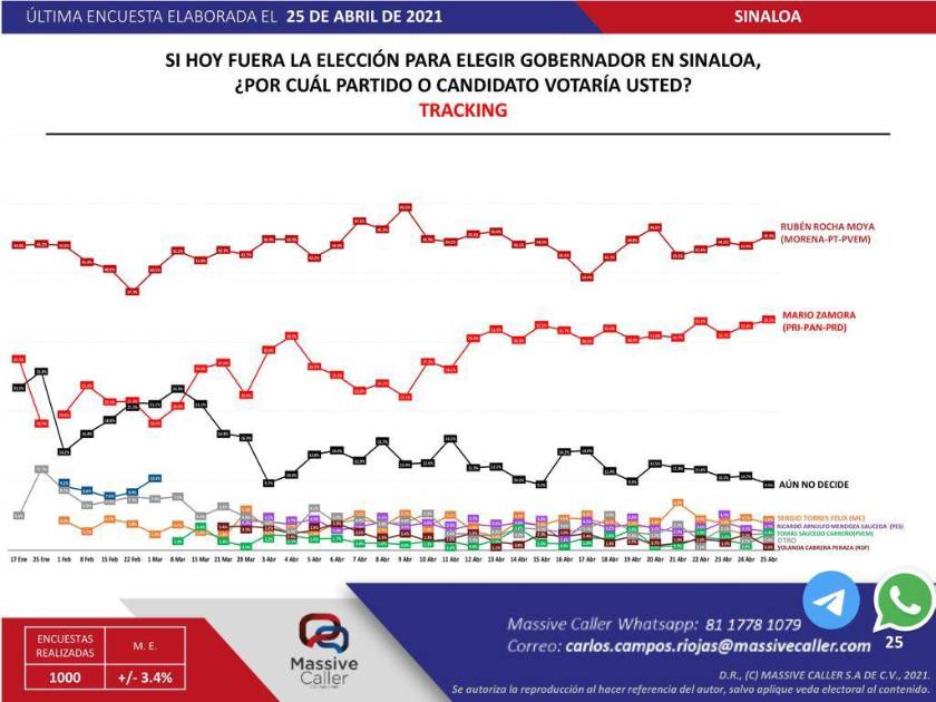 En este seguimiento de las preferencias electorales, mil personas fueron consultadas por Massive Caller y se calcula en un +/-3.4 por ciento el error muestral.