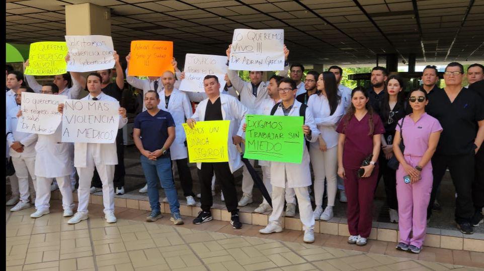 Más de una decena de médicos se manifestaron este viernes en el Palacio de Gobierno para exigir a las autoridades estatales acciones para localizar a un colega, Javier Adrián García, médico traumatólogo reportado como desaparecido en Culiacán este viernes.