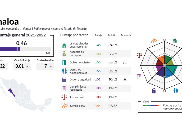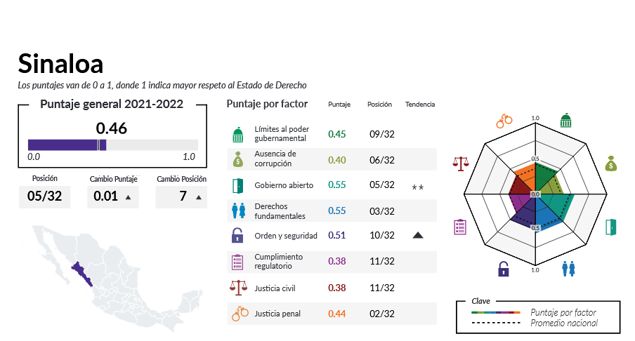 En la evaluación general, Sinaloa suma un puntaje de 0.46, donde cero es nulo apego al Estado de Derecho y 1 es total apego.