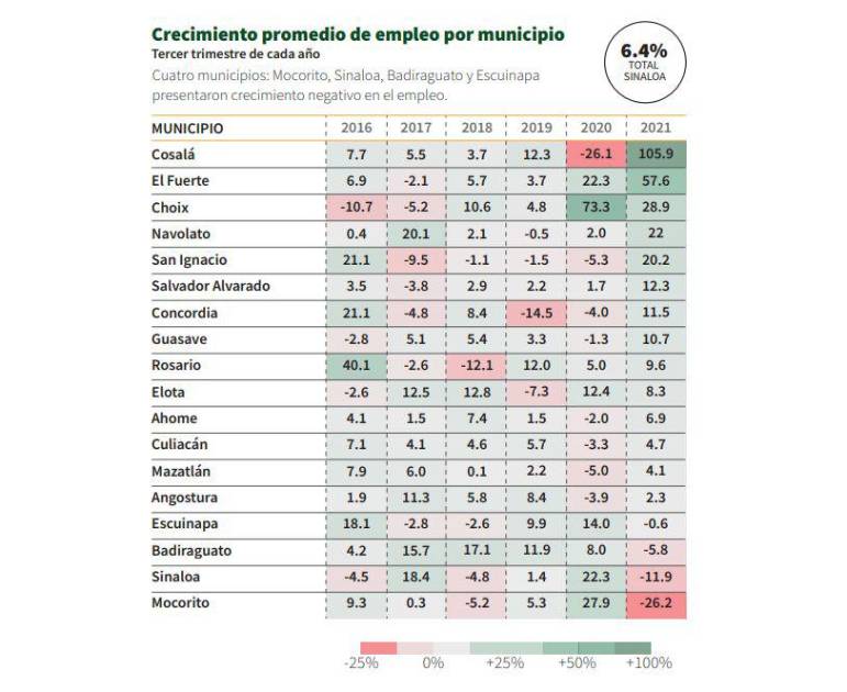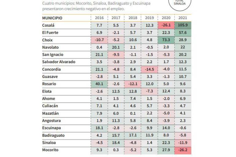 De acuerdo al informe de Empleo por Municipios y Regiones Tercer Trimestre 2021 que realiza el Consejo para el Desarrollo Económico de Sinaloa, hay cuatro municipios que presentaron un crecimiento negativo.