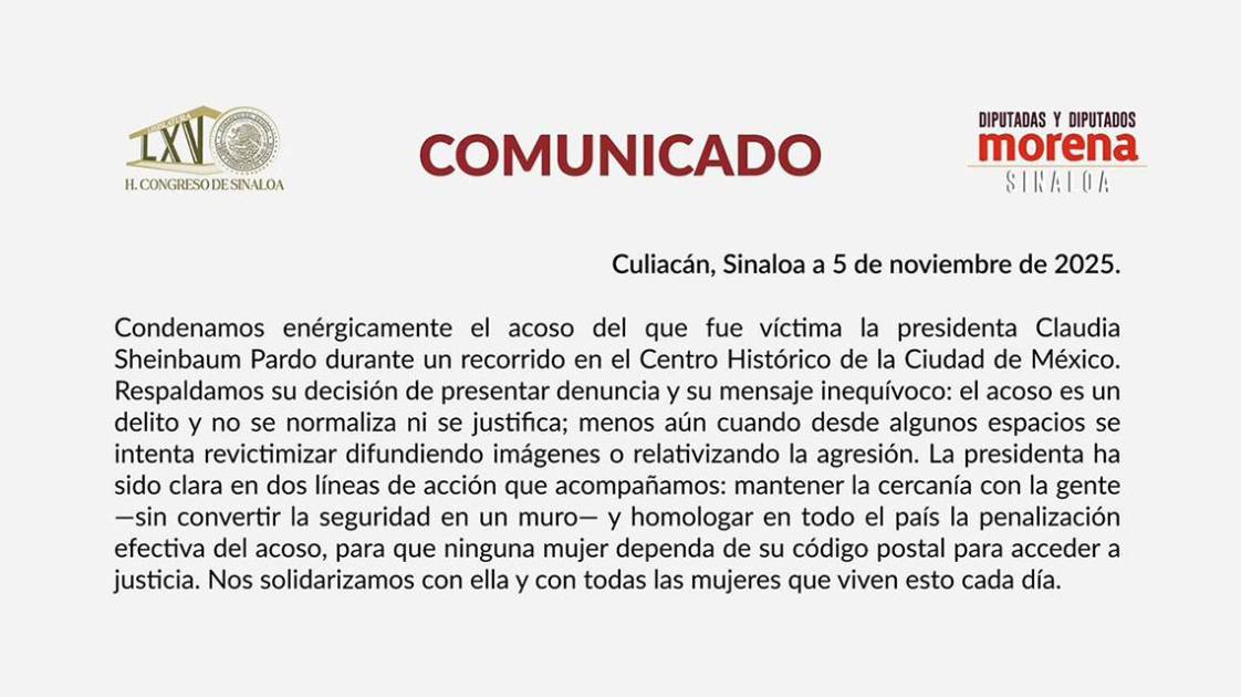 A través de un comunicado, las y los legisladores morenistas en Sinaloa destacaron el mensaje que Sheinbaum envió tras los hechos, al reiterar que el acoso es un delito que no debe justificarse ni normalizarse, y condenaron los intentos de revictimización a través de la difusión de imágenes o discursos que minimizan la agresión.