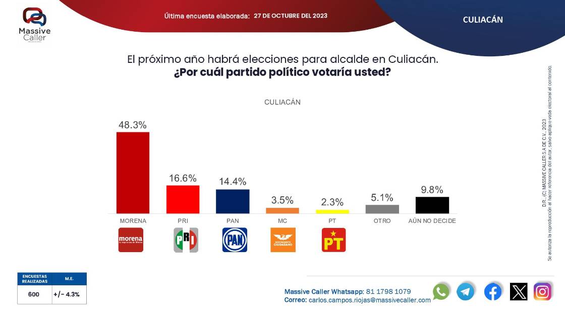 CULIACÁN._ El partido Morena estaría liderando la intención del voto en alcaldías de Sinaloa, dentro de un ejercicio de medición frente a las elecciones de 2024 realizado por la casa encuestadora a nivel nacional Massive Caller.