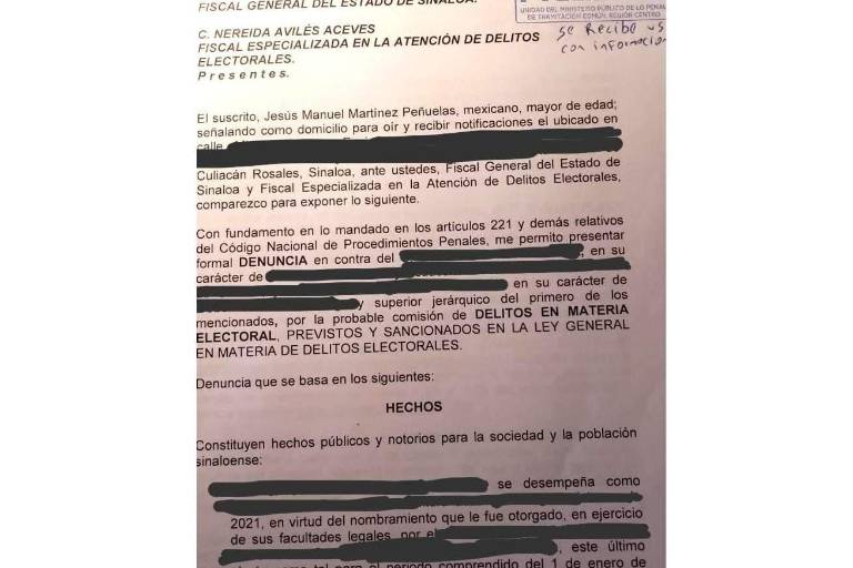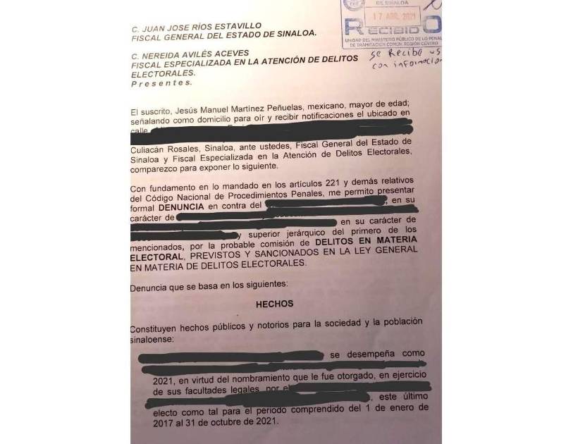 La denuncia fue presentada ante el fiscal general de Estado de Sinaloa, Juan José Ríos Estavillo, y la fiscal especializada en la atención de delitos electorales, Nereida Avilés Aceves, con fundamento en los artículos 221 y demás relativos del Código Nacional de Procedimientos Penales por la probable comisión de delitos en materia electoral, previstos y sancionados en la Ley General en Material de Delitos Electorales.