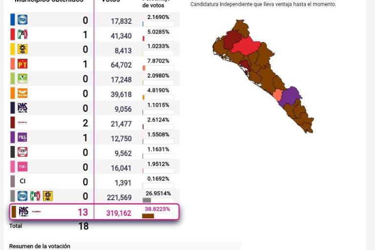 De estos 15 municipios, solo El Fuerte y Angostura representan una victoria para Morena como partido único, pues en los 13 restantes las alcaldías corresponden a candidaturas comunes Morena-PAS.