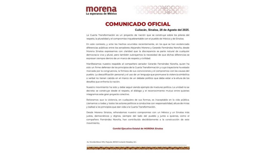 “Desde Morena Sinaloa expresamos con claridad que la discrepancia es parte natural de cualquier democracia viva y plural, pero también subrayamos la necesidad de que dichas diferencias se expresan siempre dentro de un marco de respeto y civilidad”, señala en el comunicado la delegación estatal del partido.