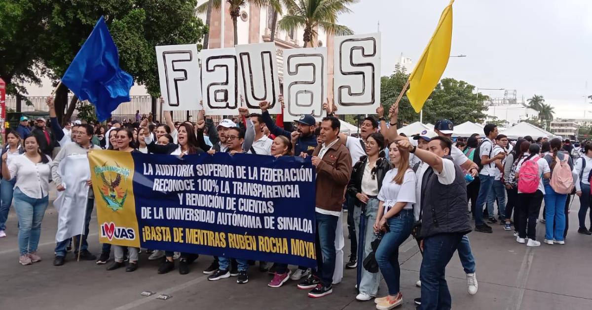 Entre sus pancartas y banderas figuran mensajes en contra del Gobernador Rubén Rocha Moya, y una defensa a la autonomía de la institución.