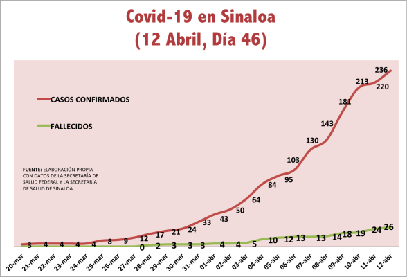 Históricamente han sido confirmados 236 casos en Sinaloa del 28 de febrero al 12 de abril, de estos 186 están activos, 24 recuperados, hay 26 decesos y 346 pacientes sospechosos en los municipios de Ahome, Choix, Culiacán, Escuinapa, Guasave, Mazatlán, Mocorito, Rosario, Salvador Alvarado, Sinaloa y Navolato.