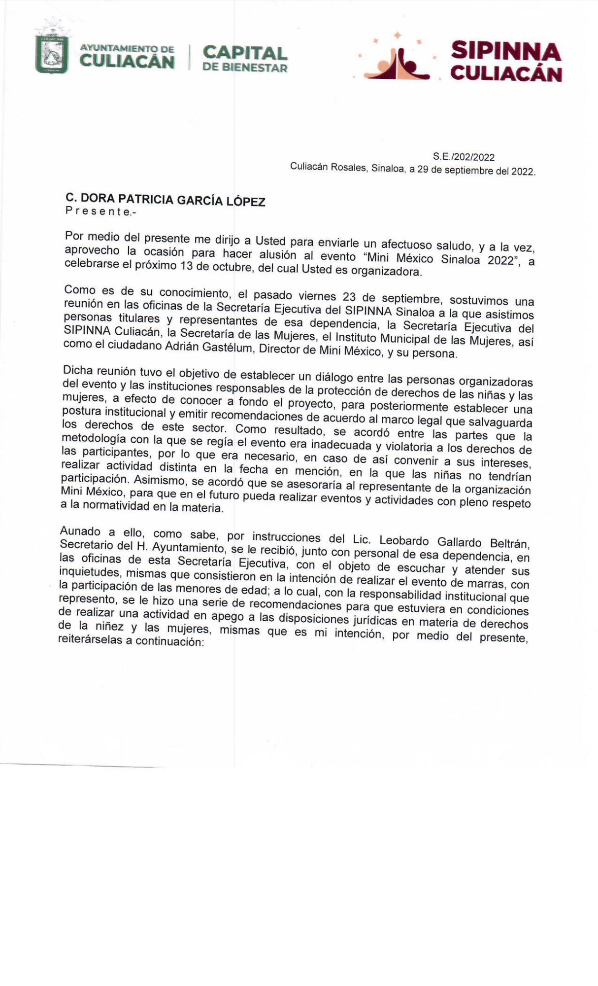 El 21 de septiembre, el Colectivo Mujeres Activas Sinaloenses solicitó públicamente la intervención de las autoridades municipales para garantizar la protección de las niñas involucradas en el concurso.