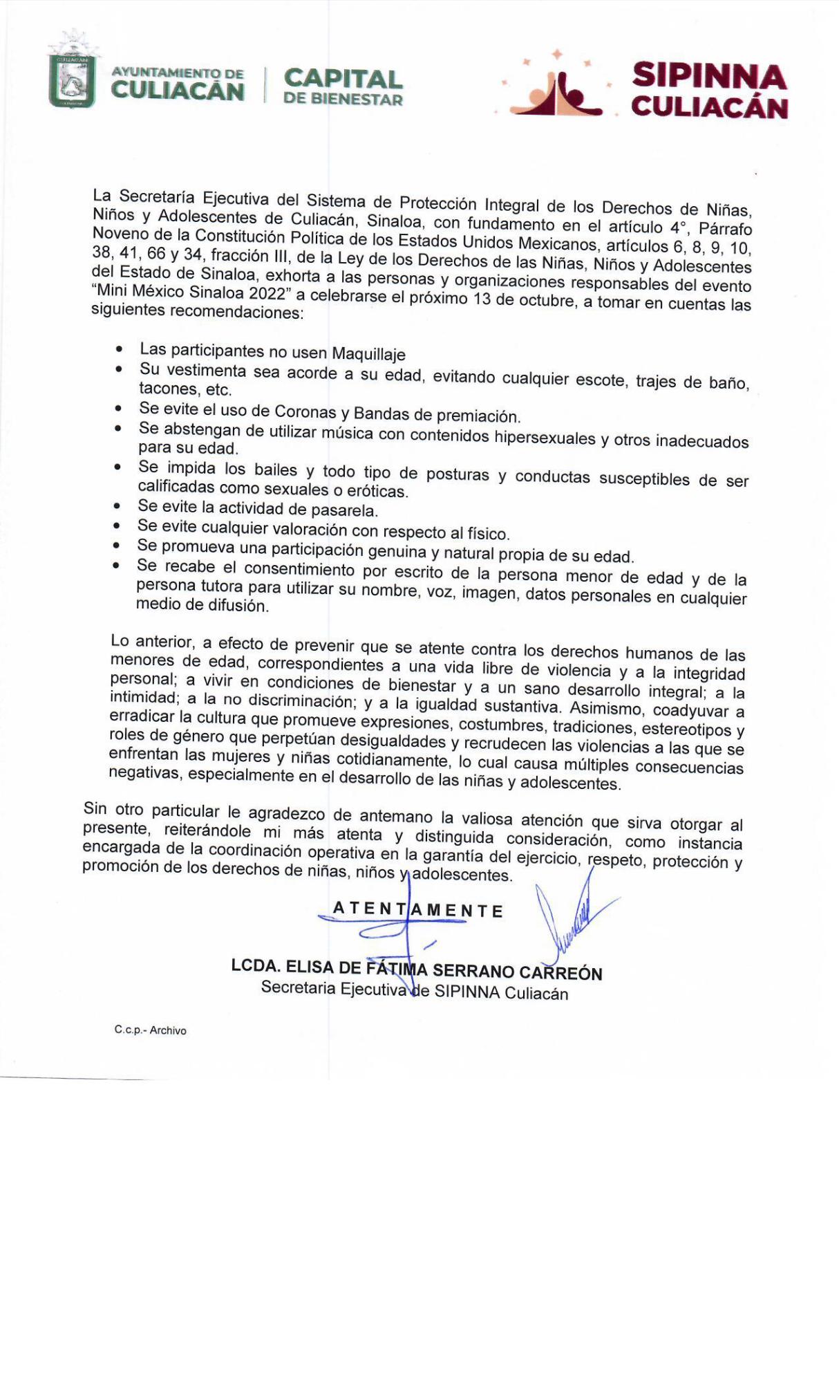El Sistema de Protección Integral de los Derechos de Niñas, Niños y Adolescentes de Culiacán emitió una serie de recomendaciones dirigidas a los organizadores de un concurso de belleza infantil que se realizará por un particular el próximo 13 de octubre.