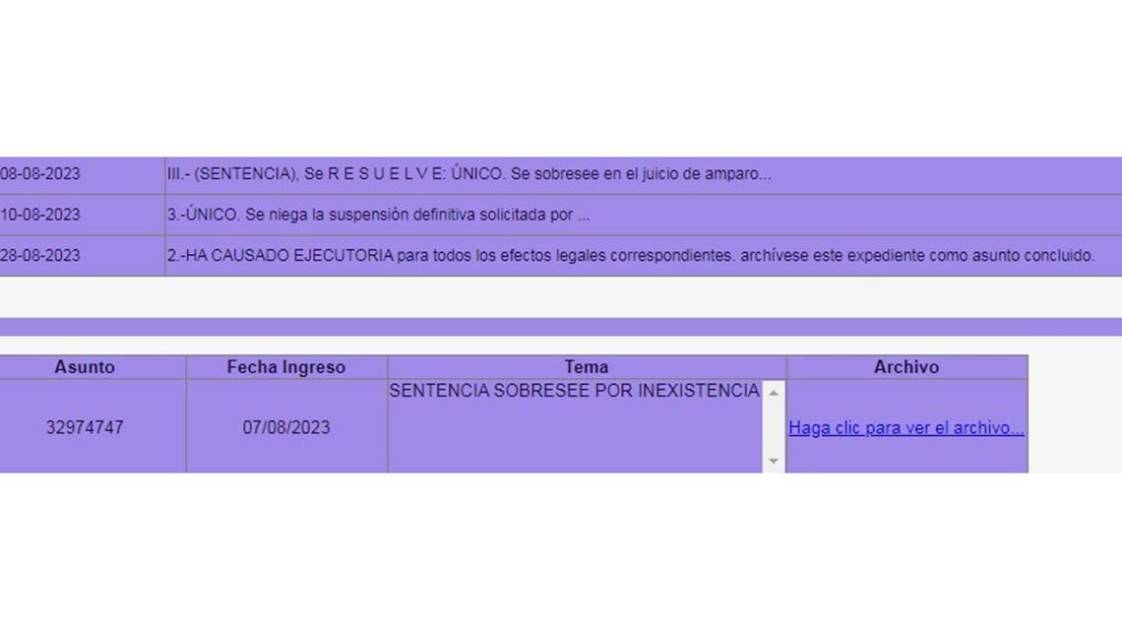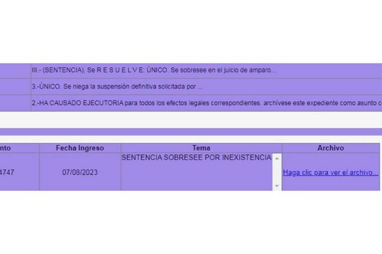 “HA CAUSADO EJECUTORIA para todos los efectos legales correspondientes. archívese este expediente como asunto concluido”, dicta por su parte la síntesis expuesta este 28 de agosto en el portal del Consejo de la Judicatura Federal.