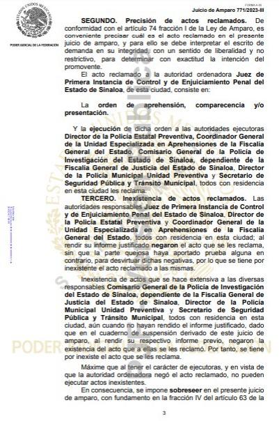 “ÚNICO. Se sobresee en el juicio de amparo promovido por * , contra el acto y autoridad precisados en la presente sentencia, por los motivos y fundamentos expuestos en el considerando tercero de esta resolución”, establece la sentencia del 8 de agosto correspondiente al desechamiento del juicio de amparo 771/2023 promovido por Aguilar Navarro.