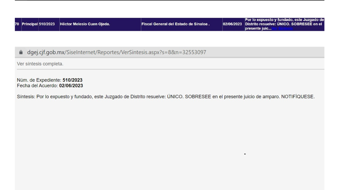 “Por lo expuesto y fundado, este Juzgado de Distrito resuelve: ÚNICO. SOBRESEE en el presente juicio de amparo. NOTIFÍQUESE”, se lee en la síntesis del expediente 510/2023 correspondiente al amparo requerido por el Presidente fundador del Partido Sinaloense.