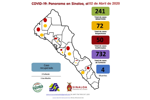 Del 28 de febrero a la fecha han sido confirmados 50 casos en Sinaloa; 43 están activos, hay tres pacientes recuperados, cuatro decesos y 72 pacientes sospechosos. El rango de edad es de los 25 a los 89 años.
