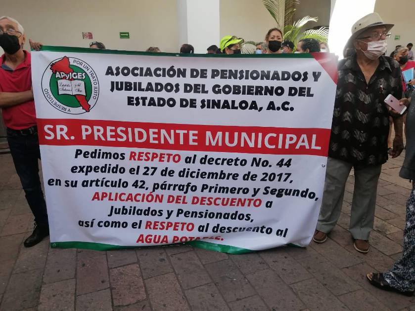 El pasado martes 16 de noviembre, miembros de la Asociación de Pensionados y Jubilados del Gobierno del Estado de Sinaloa se manifestaron en el patio principal del Ayuntamiento de Culiacán para solicitarle al alcalde que mantenga el descuento.