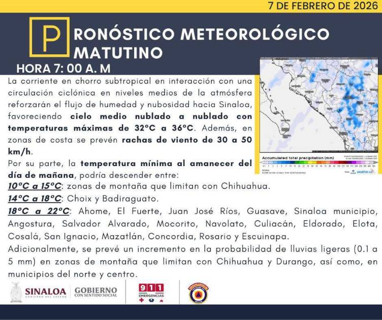 En los municipios como Ahome, El Fuerte, Juan José Ríos, Guasave, Sinaloa municipio, Angostura, Salvador Alvarado, Mocorito, Navolato, Eldorado, Elota, Cosalá, San Ignacio, Mazatlán, Concordia, Rosario y Escuinapa se esperan temperaturas mínimas de 18 a 22 grados centígrados.