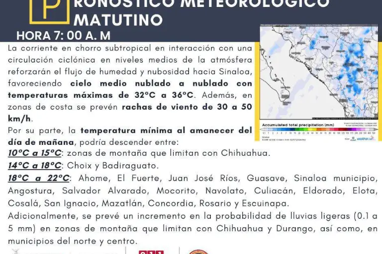 Aunque las temperaturas máximas estatales aún oscilarán entre los 32 y 36 grados centígrados, hacia las zonas de montaña y la costa se anticipan rachas de viento de entre 30 y 50 kilómetros por hora específicamente en las zonas costeras, mientras que en las regiones serranas que limitan con Chihuahua y Durango, y en algunos municipios del norte y centro, existe una probabilidad de lluvias ligeras de 0.1 a 5 milímetros.
