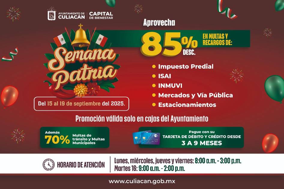 La campaña ‘Semana Patria’ se extenderá del 15 al 19 de septiembre de 2025, con hasta el 85 por ciento de descuentos en multas y recargos en impuesto predial, Impuesto sobre Adquisición de Inmuebles (ISAI), Instituto Municipal de la Vivienda (INMUVI), Mercados y Vía Pública y Estacionamientos.