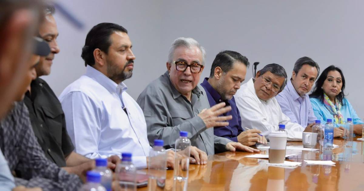 El Gobernador Rubén Rocha Moya estuvo acompañado en esta reunión por el Secretario de Administración y Finanzas, Enrique Díaz Vega; de Agricultura y Ganadería, José Jaime Montes Salas; por el encargado del Despacho de la Secretaría General de Gobierno, Rodolfo Jiménez López; por el director del SATES, Ismael Bello Esquivel y el Subsecretario de Agricultura, Ramón Gallegos Araiza.
