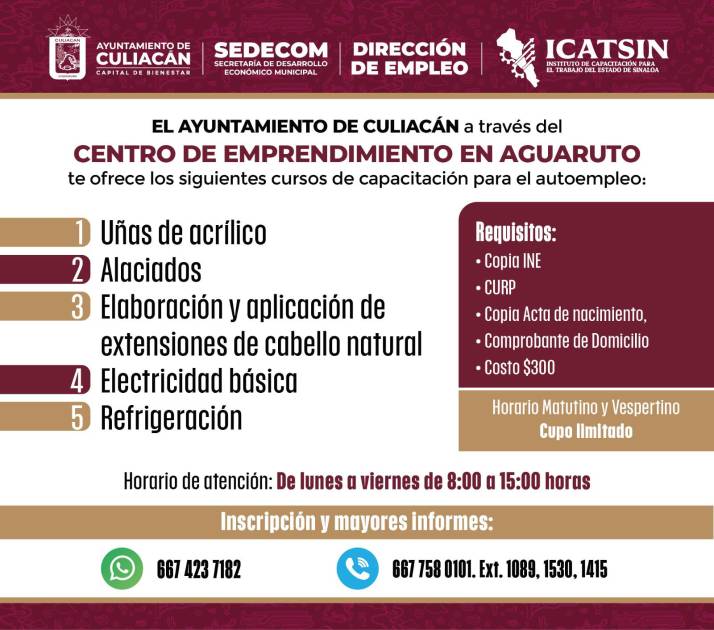 CULIACÁN._ La dirección del Empleo del Ayuntamiento de Culiacán ofrecerá cursos para el autoempleo en Centro de Emprendimiento de la sindicatura de Aguaruto.