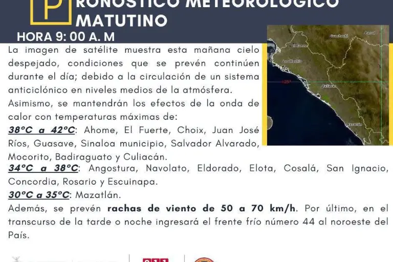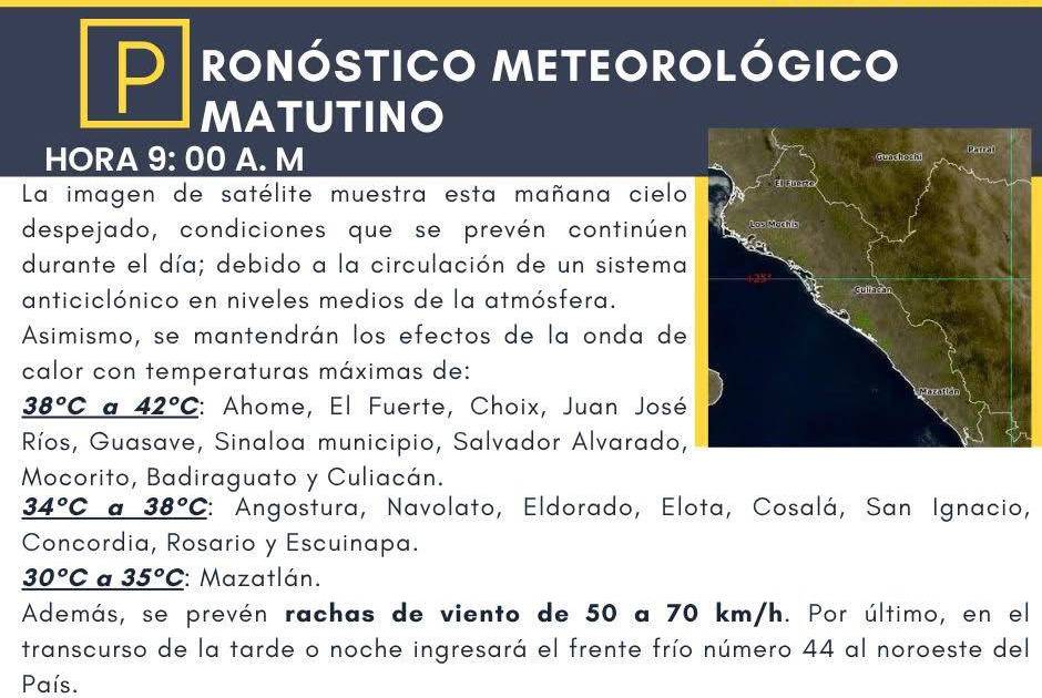 Municipios como Ahome, El Fuerte, Choix, Juan José Ríos, Guasave, Sinaloa Municipio, Salvador Alvarado, Mocorito y Badiraguato, se mantienen como las zonas más calientes, con máximas que oscilan entre los 38 y 42 grados.