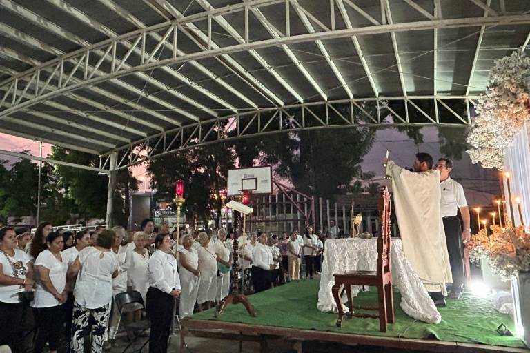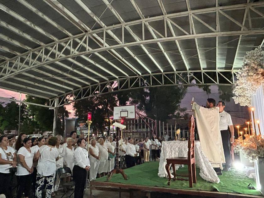 La ceremonia se realizó a las 18:00 horas de este lunes en la cancha de futbol, donde fue instalado un templete con imágenes religiosas, veladoras y un coro que acompañó las oraciones.