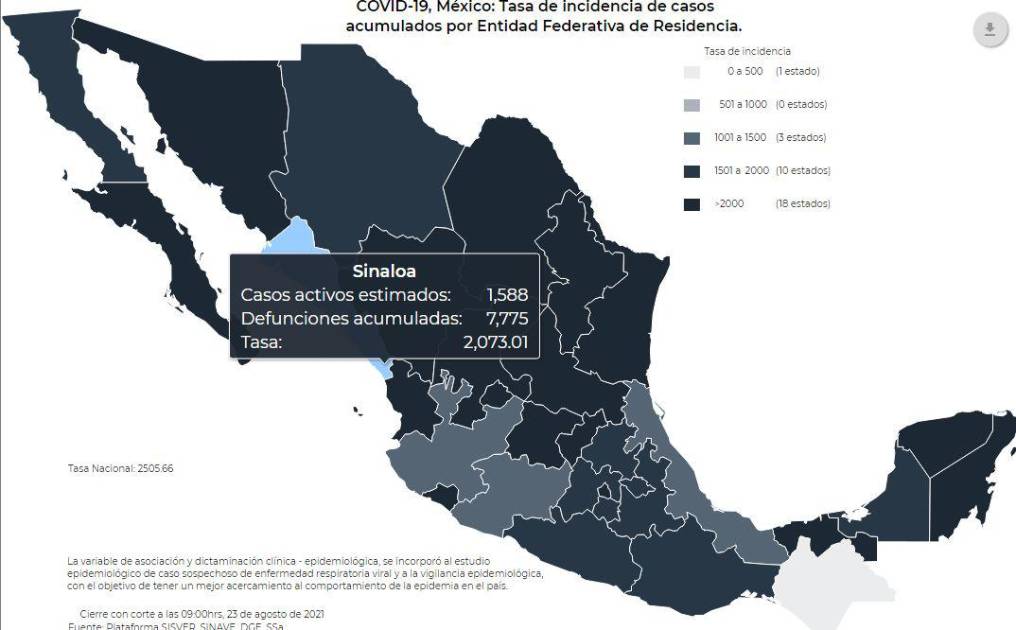 Desde el 28 de febrero que fue detectado el primer caso hasta el 23 de agosto han confirmado en Sinaloa 66 mil 662 casos, de los cuales mil 808 son pacientes activos.