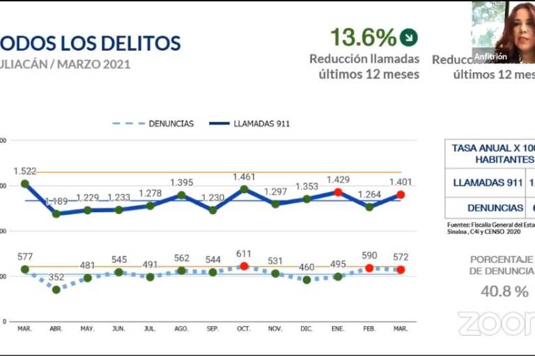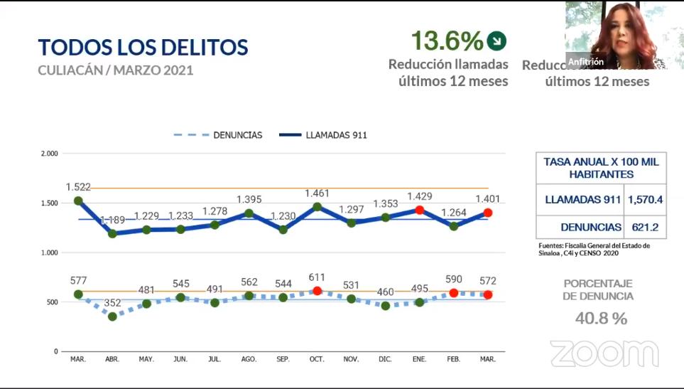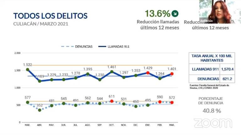 En total, por los 11 delitos, hubo una baja de 590 a 572 denuncias interpuestas ante el Ministerio Público, pero las llamadas fueron hacia arriba, de mil 264 de febrero, marzo cerró hasta las mil 401.
