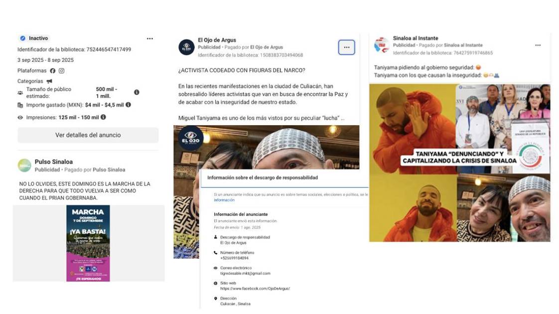 Las páginas que han invertido en estas campañas son Pulso Sinaloa, Sinaloa al instante y El Ojo de Argus, en un total de 8 publicaciones que suman poco más de 50 mil pesos invertidos, de acuerdo con los datos de la Biblioteca de Anuncios de Meta, compañía propietaria de la red social Facebook.
