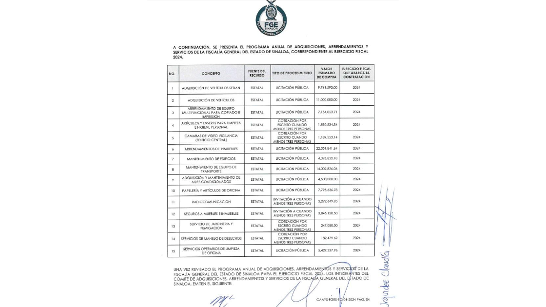 De cara al ejercicio fiscal 2024, la Fiscalía General del Estado de Sinaloa proyectó en su programa anual que el 58.4 por ciento de su gasto en compras, arrendamientos y servicios, serán destinados a conceptos de limpieza, mantenimiento y renta de inmuebles.