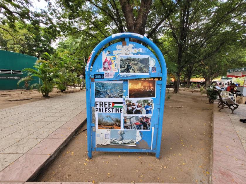 Un grupo liderado por el activista Óscar Loza Ochoa pegó en algunas zonas de la plazuela Obregón, en el Centro de Culiacán, imágenes con la leyenda “Palestina Libre” como una manera de exponer las consecuencias del conflicto bélico entre Israel y el grupo Hamás de la Franja de Gaza.