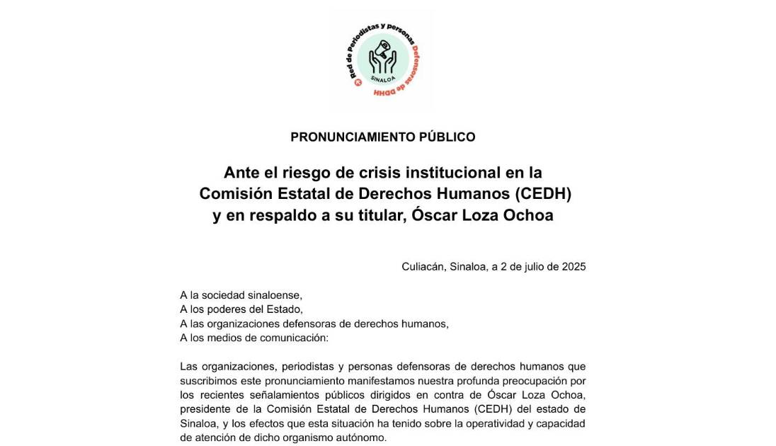 “Sin menoscabar el derecho a la libre expresión y protesta, enfatizamos que ningún derecho puede ejercerse a costa de la vulneración de otros, especialmente cuando ello impide la operación de una institución fundamental en la protección de los derechos de la ciudadanía”. En las últimas semanas en la Comisión Estatal de los Derechos Humanos ubicada en Culiacán se han realizado manifestaciones que han expuesto presuntas agresiones por parte de Loza Ochoa.