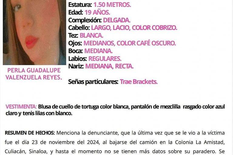El trayecto a casa de Perla Guadalupe Valenzuela Reyes, de 19 años de edad, fue interrumpido por dos civiles a bordo de un carro en la colonia Amistad, en Culiacán. La subieron a la unidad un sábado por la noche, y más de 48 horas después no se sabe de ella.