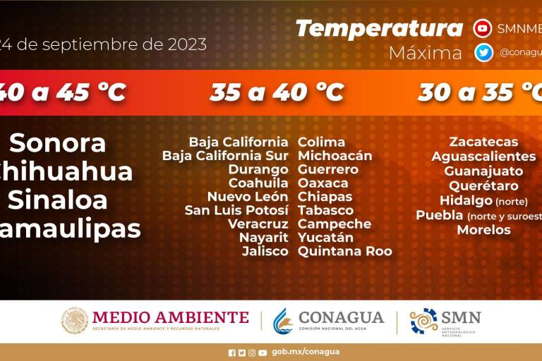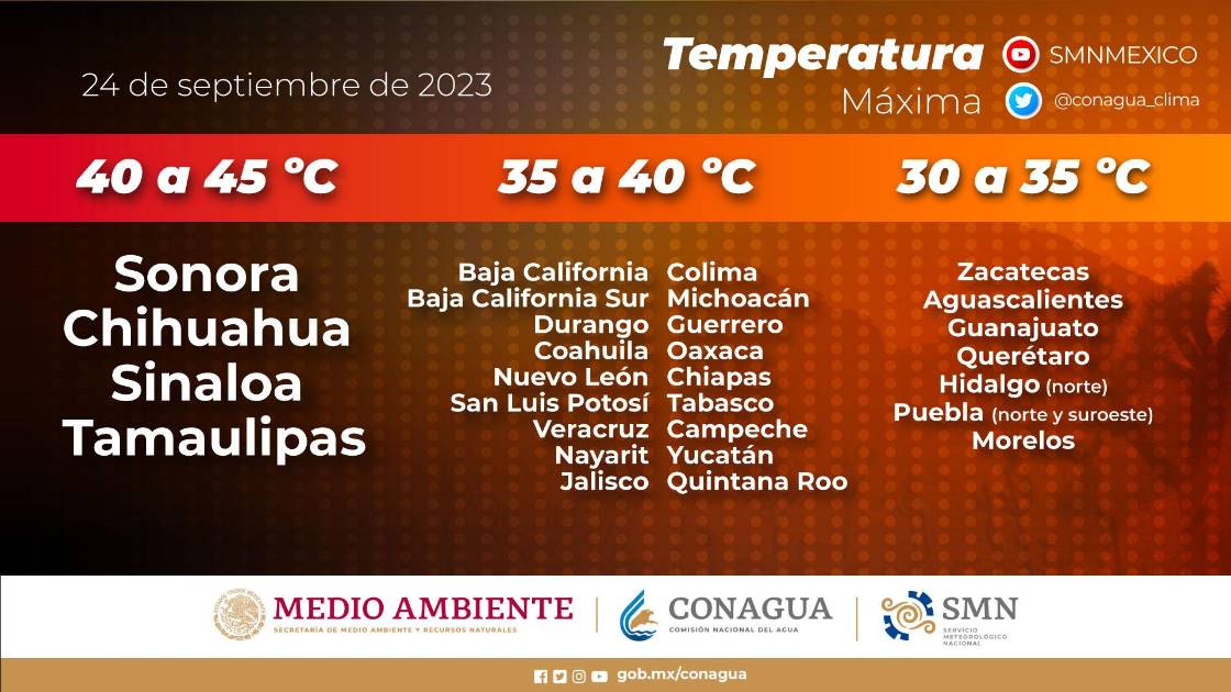 De acuerdo a Protección Civil, la temperaturas máximas al norte rondarían los 30 a 44 grados; en el centro variarían entre 36 y 41 grados; y al sur se esperan entre 32 y 38 grados por la tarde.