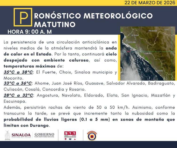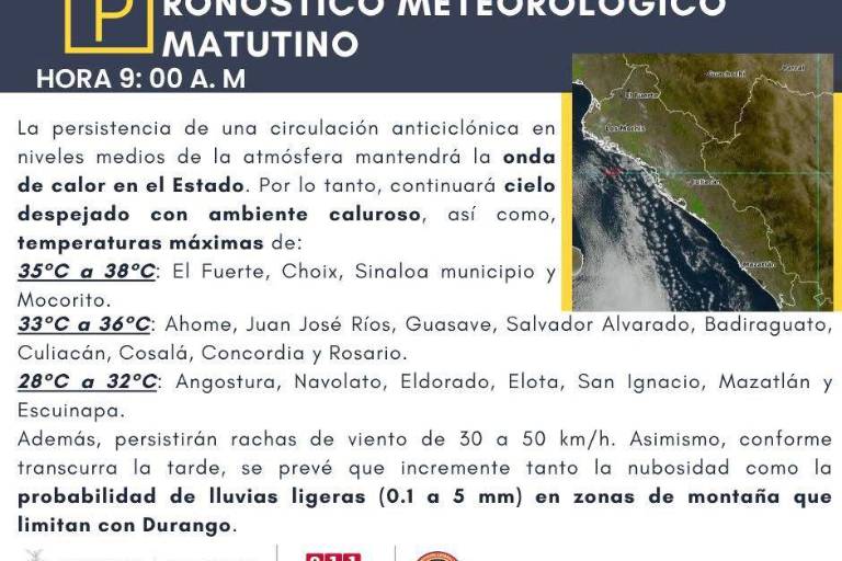 En Ahome, Juan José Ríos, Guasave, Salvador Alvarado, Badiraguato, Cosalá, Concordia y Rosario, se tendrán temperaturas entre 33 y 36 grados.