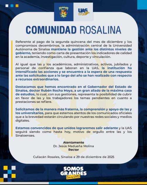 El pasado martes, la Universidad Autónoma de Sinaloa informó que pagaría la mayor parte del aguinaldo el 24 de diciembre, como resultado de gestiones ante autoridades estatales y federales para enfrentar la crisis financiera de cierre de año.