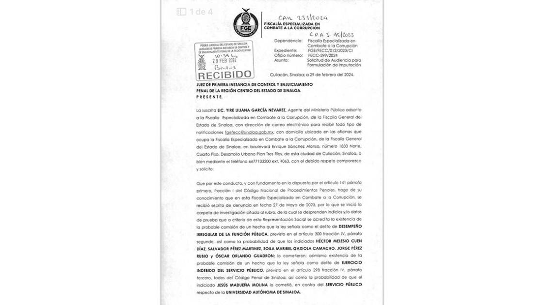 La Fiscalía Especializada en Combate a la Corrupción solicitó formalmente este jueves que se agende audiencia pública para acusar en un sexto proceso judicial al Rector de la Universidad Autónoma de Sinaloa separado del cargo Jesús Madueña Molina y a otros ex funcionarios.